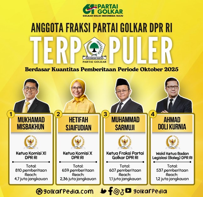Ketua Komisi XI DPR RI yang juga merupakan Ketua Umum Depinas SOKSI, Misbakhun kembali meraih posisi pertama sebagai anggota Fraksi Partai Golkar DPR RI terpopuler periode Oktober 2025. Nama Misbakhun berhasil memuncaki daftar politisi Partai Golkar terpopuler setelah pada periode sebelumnya atau pada bulan September 2025 namanya juga ada di posisi pertama anggota Fraksi Partai Golkar DPR RI terpopuler.