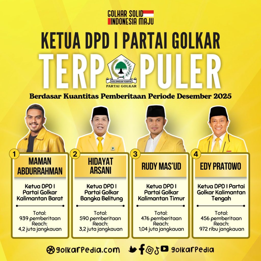Di posisi empat, ada nama Ketua DPD I Partai Golkar Kalimantan Tengah, Edy Pratowo yang juga menjabat sebagai Wakil Gubernur Kalteng. Ini kali pertama bagi Edy Pratowo masuk daftar sebagai Ketua DPD I Partai Golkar terpopuler. Selama periode Desember 2025, ia memiliki sebanyak 456 pemberitaan dengan jangkauan mencapai 972 ribu reach.